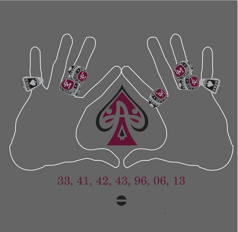 Designed exclusively by Freshmen Select. Features "Aces Hands" wearing rings representing the Aces' seven state titles. Years listed below. This is a SUPER soft, premium dark gray tee, available in very limited quantities. Allow 2-3 weeks for shipping.